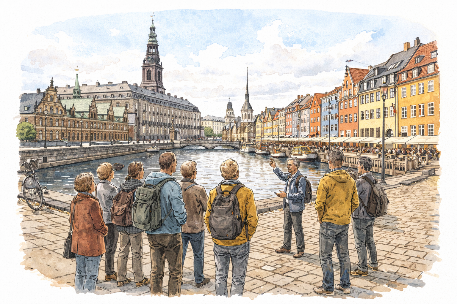 Gruppen går direkte fra hotellet på guidet byvandring i Københavns centrum.