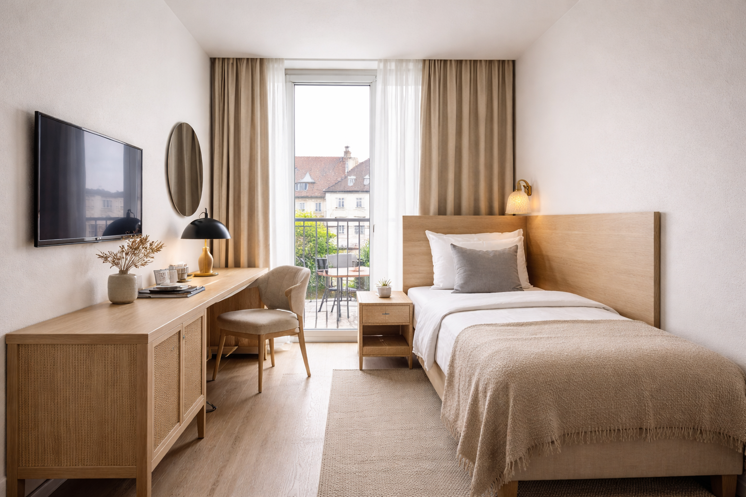 Vores single rooms er indrettet med fokus på komfort. Værelset har en komfortabel seng, arbejdsplads og siddeplads,