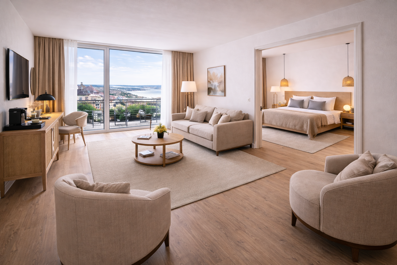 Junior suiterne tilbyder markant mere plads og komfort. Værelset er ét stort rum med tydeligt opdelt sove- og opholdsområde, hvor opholdsdelen er indrettet med sofa og lænestole.